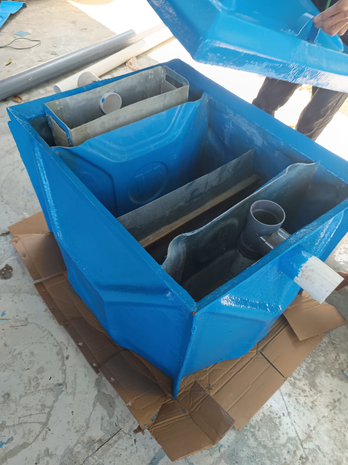 Proses finishing ini merupakan tahap akhir fabrikasi unit pengolahan limbah cair khusus untuk area dapur/kantin, guna memastikan sistem kedap air, tahan korosi, dan siap dioperasikan.